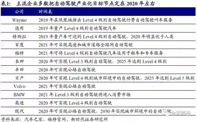 随着算法和传感器领域的不断进步,汽车制造和互联网科技企业纷纷加大了对自动驾驶行业的布局力度。其中,Waymo、GM Cruise和Tesla等公司在产业化成熟度上较为领先,其他厂商多数把量产乘用车实现Level 3以上级别自动驾驶的时间表定在了2020-2021年左右。
