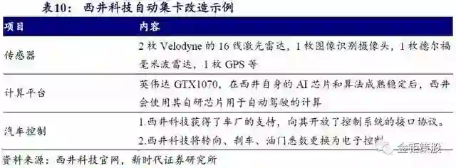 2018年1月西井科技联合振华重工,在珠海港先后进行了跨运车和集装箱卡车的自动化运行演示,上述车辆可以全自动完成集装箱的装卸、运输动作。传感器方面,西井科技在车辆上使用了16线激光雷达、毫米波雷达、图像识别摄像头和GPS等传感器,同时,车厂向其开放了控制部分的接口协议,西井将车辆的机械控制普遍更新为电子控制。