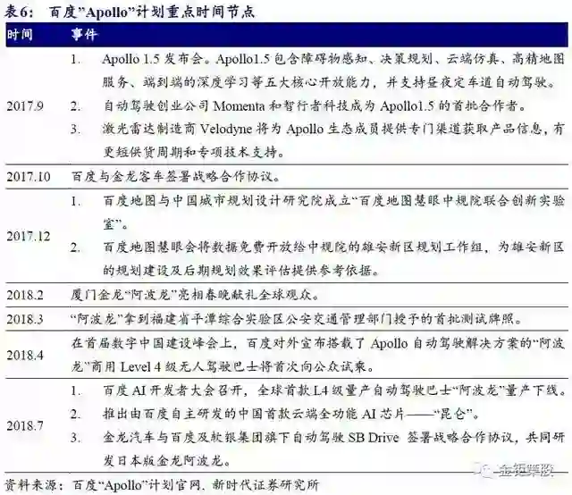 百度于2017年提出”Apollo”计划,该计划整合了从自动驾驶产业链从软件、硬件、传感器到高精度地图等全部方向,同时很好地整合了整车厂和零部件企业,力图打造基于具有统一技术标准的自动驾驶系统。我们认为该计划是国内最有机会实现产业链整合,在软件、硬件层面制定自动驾驶技术标准的自动驾驶项目。
