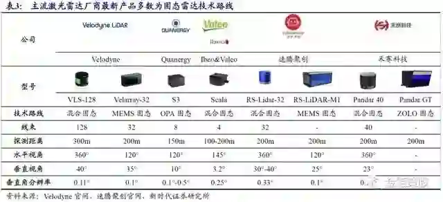 在技术路线方面,各大激光雷达厂商纷纷将发展重心从机械式激光雷达转向了固态激光雷达。固态雷达在成本和可靠性上更有优势,但精度水平仍低于机械式雷达。固态激光雷达三种主流技术路线包括MEMS、OPA相控阵和Flash。基于这三种路线推出的产品有Velodyne的Velarray-32、Quanergy的固态OPA激光雷达S3、速腾聚创的RS-LiDAR-M1等。