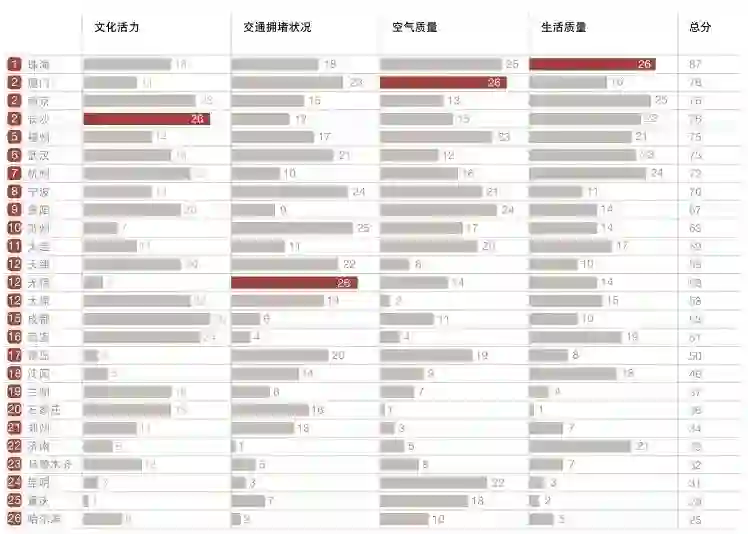 除北上广深四城以外,26 座城市的综合数据梳理结果:杭州位居第一,随后是武汉、南京、成都、厦门、西安、天津,至此排序与上年相同;接下来是长沙、苏州、郑州、珠海、青岛、济南、昆明、重庆、宁波,其中长沙上升了两位,青岛排在了济南的前面,但重庆却下降了三个位次。