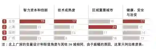从维度积分来看,北京在“智力资本和创新”、“技术成熟度”、“健康、安全与治安”、“交通和城市规划”、“经济影响力”五个维度居前;上海在“区域重要城市”、“宜商环境”积分高居在第二;深圳在“交通和城市规划”与北京并列、并在“可持续发展与自然环境”和“宜商环境”领先居第三;广州在“区域重要城市”和“经济影响力”维度均超越深圳,但因在其他维度居后总积分低而屈居第四。