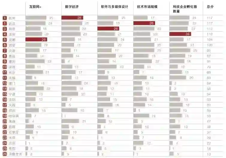 “其中,排在前列的是南京、武汉、西安、杭州、天津。最后两个变量反映的是“双创”,创新和创业,排在前三位的都是杭州、成都、南京。这两个维度与“研究与开发水平”一起在某种程度上反映了大学以上教育的成果,它们既反映科技创新的局面,也构成了智力资本的重要要素。