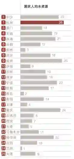 数据梳理结果,长沙与杭州并列第一。长沙在维度中居首得益于在“碳排放”变量上排第一,在“污水集中处理率和生活垃圾无害化处理率”变量上排第二,在“居民人均水资源”位列第四,使得累计积分最高。变量统计是枯燥的,并且有些抽象,但这一结果与现实生活却十分贴切。