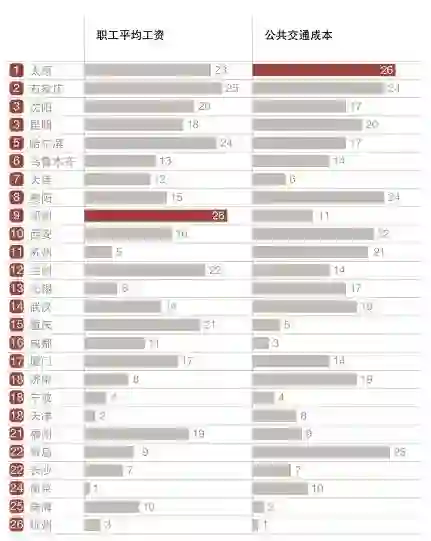 在本维度中排在第一二位的是太原和石家庄,太原因“公共交通成本”、“生活服务价格”相对低而居前,石家庄则因在“职工平均工资”、“商业用地成本”、“食品价格”变量上积分高而排在前列。