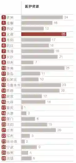 在本维度中设计了五个变量,分别是“医护资源”、“医疗设施”、“养老服务”、“城市交通安全指数”和“灾害损失”。本维度排名前五位的城市分别为杭州和成都(并列)、西安、太原和贵阳,随后是武汉、珠海、长沙和郑州(并列)以及济南。