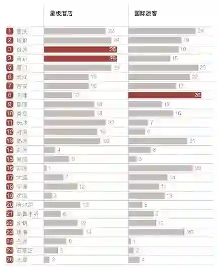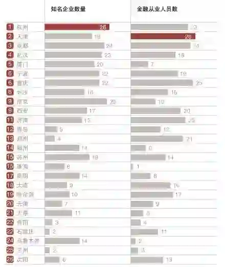 作为直辖市的天津,在26座城市的排名中仅列第七位,天津在这个维度能够凸现出来,一定程度上是因为“金融从业人员”采用的是按绝对数取值。