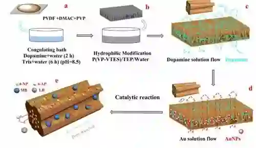 1)PVDF瞬时催化及油水分离膜。针对复杂体系的油水分离问题,以机械性能和热稳定性能优异的聚偏氟乙烯(PVDF)为基膜,制备得到具有微纳米多级组装结构的PVDF-AuNPs微反应器分离膜。首先利用聚多巴胺作为膜表面“功能涂层”,对PVDF基膜进行初步修饰,然后将AuNPs微球通过动态过滤的方法负载到PVDF的指状孔内,形成微反应器。所得膜能够对含有硝基苯酚的水包油复杂体系,实现瞬时的硝基苯酚催化降解和油水分离。该方法对于将油水分离膜应用于实际含油废水处理,起到了重要的推动作用。相关工作已经发表于Chemical Engineering Journal, 2018, 334,579,副研究员王建强和吴紫阳为共同第一作者,刘富为通讯作者。
