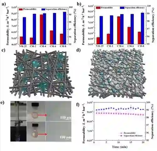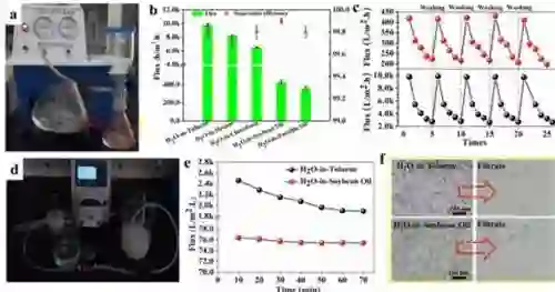 2)具有超稳定刚性浸润表面的柔性PVDF油水分离膜。针对通常聚合物微孔膜的表面微纳结构不稳定、在化学腐蚀及物理损伤下易蠕变及衰减的问题,通过仿生植物根系固定土壤模型,利用微孔PVDF膜表面的微纳结构限域固定TiO2纳米粒子,制备了具有刚性界面TiO2界面的柔性PVDF微孔膜。所得膜具有优异的稳定性,能够抵抗极端物理损伤(液压、手指擦拭、液氮淬火后砂纸磨擦)、高温和苛刻的化学腐蚀(强酸、强碱、强氧化剂次氯酸钠),并且能够连续有效分离含有表面活性剂的油包水乳液。在错流模式下,通过负载超亲水纳米TiO2粒子制备的PVDF膜,可实现水包油乳液的连续分离(通量达1700 ,分离效率>96%)(如图3)。 相关工作已经发表于Scientific Reports, 2017, 7: 14099,副研究员熊竹和林海波为共同第一作者,刘富为通讯作者,文章发表后受到了同行的广泛关注,该论文是2017年Scientific Reports期刊阅读量最多的前100篇文章之一。