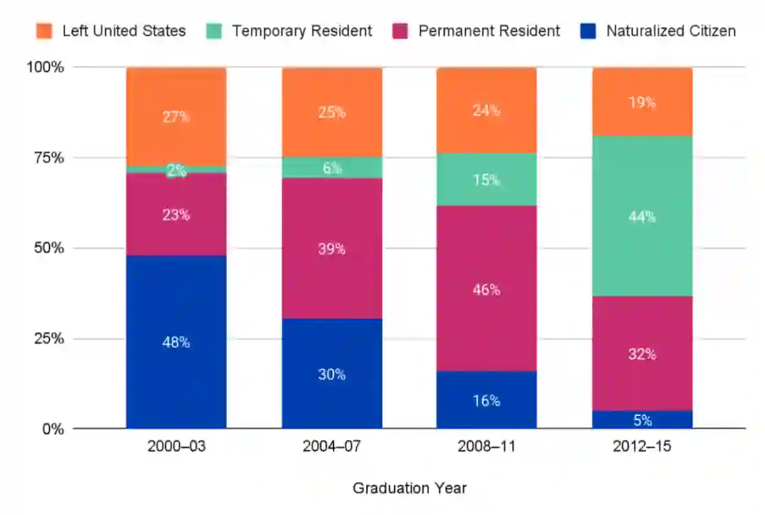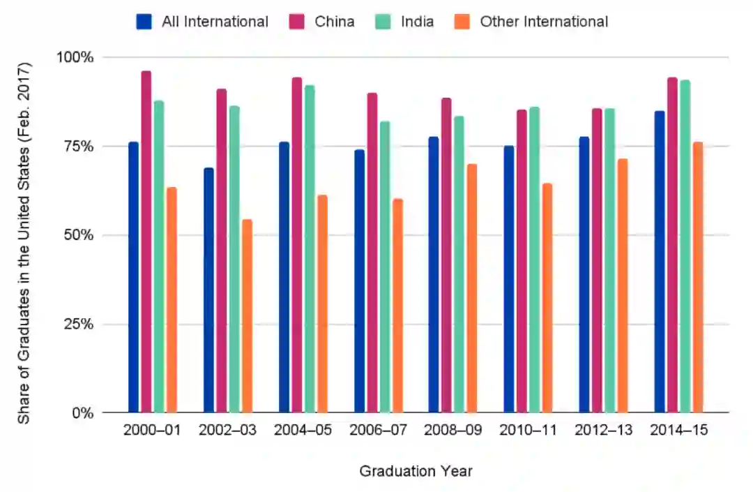 截至 2017 年 2 月,在 2000-2015 年间获得 STEM 博士学位的 90% 中国公民和 87% 印度公民仍在美国生活,而其他国家的毕业生中这一比例仅为 66%。数据还表明,在离开美国的中国和印度毕业生中,大多数是在毕业后立即离开的,而其他国际学生则更有可能随着时间的推移逐渐离开美国。