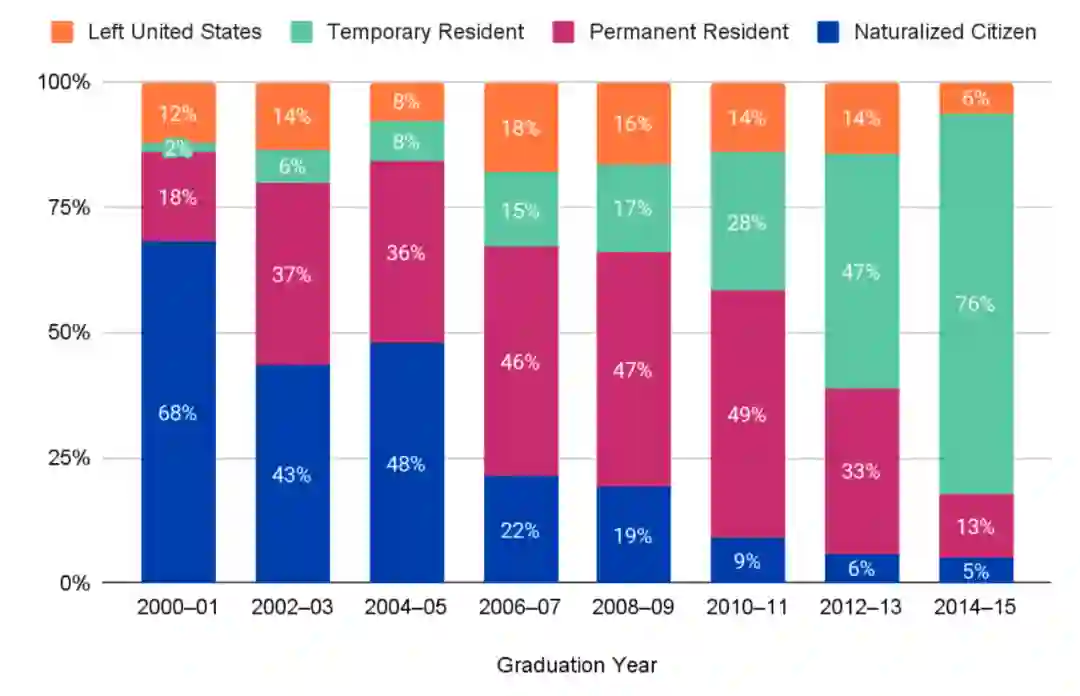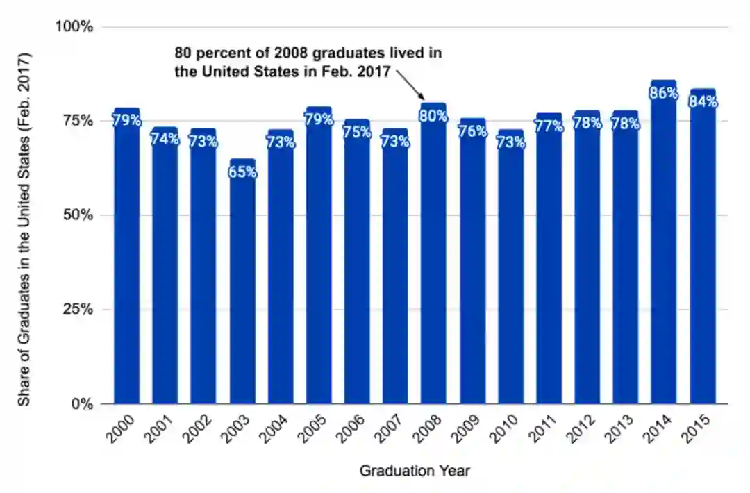 绝大多数从美国大学获得博士学位的国际学生在毕业后会留在美国多年。截至 2017 年 2 月,在 2000 年至 2015 年毕业的国际 STEM 博士中,约有 77% 仍居住在美国。自 2000 年以来,每年至少有 65% 的毕业生留在美国,而自 2004 年以来,没有一届毕业生的留存率低于 73%。