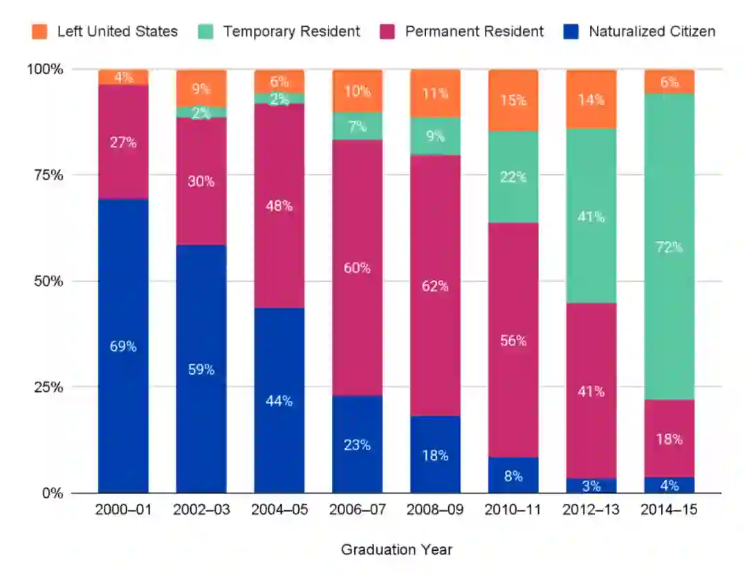 在获得博士学位后的最初几年,国际 STEM 博士毕业生最有可能作为临时居民生活。许多在 2017 年 2 月之前毕业 6 至 13 年的外国国民已获得绿卡,许多毕业于 14 年前的外国国民已加入美国国籍。在 2000 年至 2007 年间,大约有 8 万名国际学生在美国大学获得了 STEM 博士学位,其中大约有 5.6 万人 (70%) 在 2017 年 2 月成为永久居民或入籍公民。