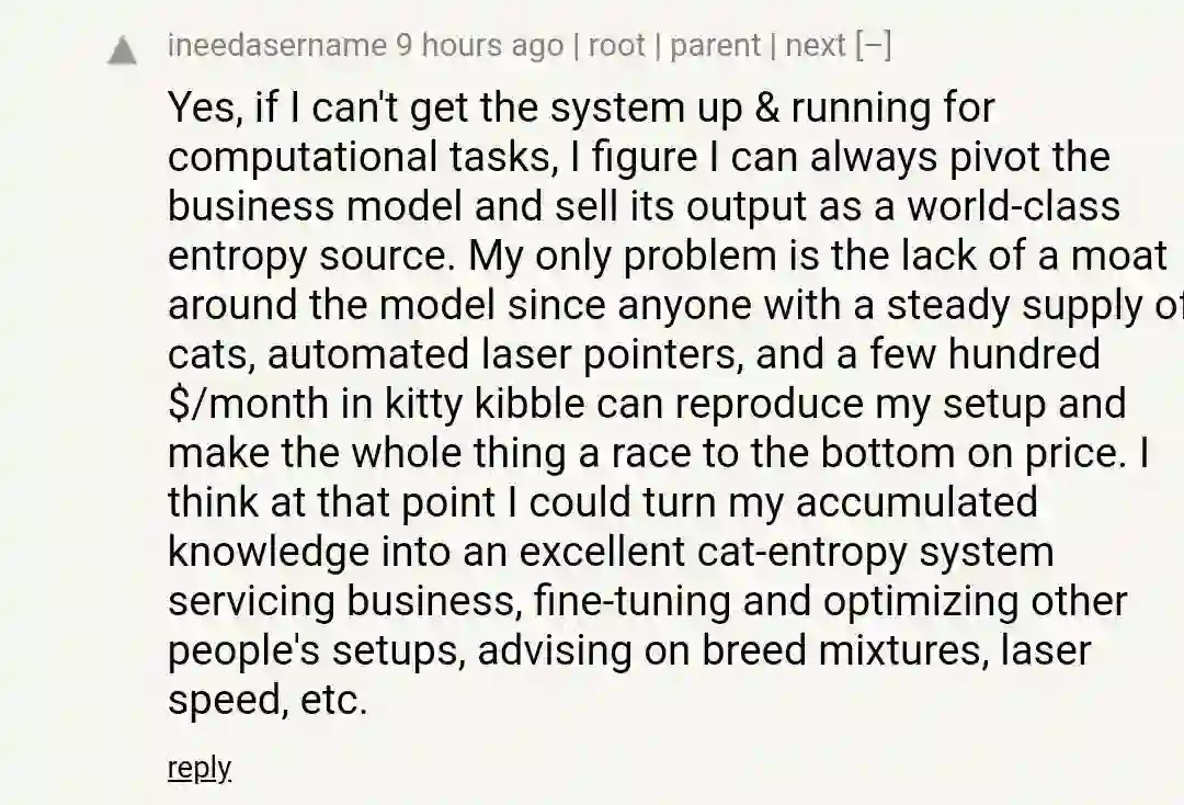 技术上是没啥护城河(任何一个有猫、猫粮、激光装置的人都能做到),不过可以通过混合不同品种的猫粮,改变激光速度等方式,把积累的知识转化为一个优秀的猫熵(Cat-Entropy)系统服务业务。