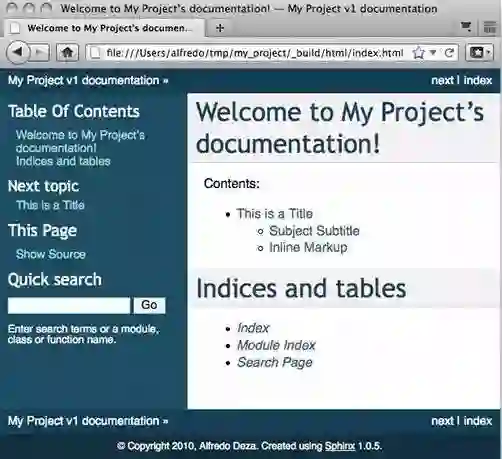 在 _build 目录内,现在应该有两个目录:doctrees 和 HTML。我们对于这个存储了文档网站所需的全部文件的 HTML 目录很感兴趣。使用浏览器打开 index.html 文件,就会发现如 图 1 所示的内容。