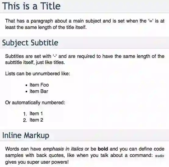 正如您所看到的,纯文本格式的语法非常容易读懂。在创建特定格式(如 HTML)时,标题会成为主要目标,其字体会比副标题大一些(理应如此),并且会对编号列表进行适当的编号。您已经拥有一些非常强大的功能。添加更多的项或更改编号列表中的顺序不会影响到编号,而通过替换使用的下划线可以改变标题的重要性。