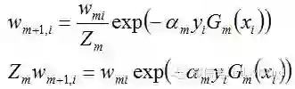即如果某个样本被分错了,则yi * Gm(xi)为负,负负得正,结果使得整个式子变大(样本权值变大),否则变小。