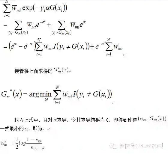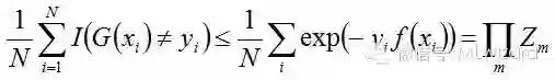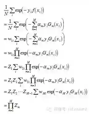 这个结果说明,可以在每一轮选取适当的Gm使得Zm最小,从而使训练误差下降最快。接着,咱们来继续求上述结果的上界。