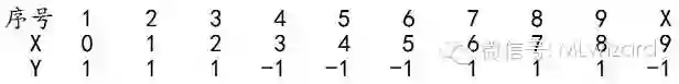 拿到这10个数据的训练样本后,根据 X 和 Y 的对应关系,要把这10个数据分为两类,一类是“1”,一类是“-1”,根据数据的特点发现:“0 1 2”这3个数据对应的类是“1”,“3 4 5”这3个数据对应的类是“-1”,“6 7 8”这3个数据对应的类是“1”,9是比较孤独的,对应类“-1”。抛开孤独的9不讲,“0 1 2”、“3 4 5”、“6 7 8”这是3类不同的数据,分别对应的类是1、-1、1,直观上推测可知,可以找到对应的数据分界点,比如2.5、5.5、8.5 将那几类数据分成两类。当然,这只是主观臆测,下面实际计算下这个具体过程。