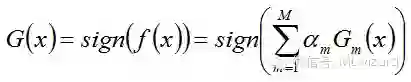 综上,将上面计算得到的a1、a2、a3各值代入G(x)中,G(x) = sign[f3(x)] = sign[ a1 * G1(x) + a2 * G2(x) + a3 * G3(x) ],得到最终的分类器为: