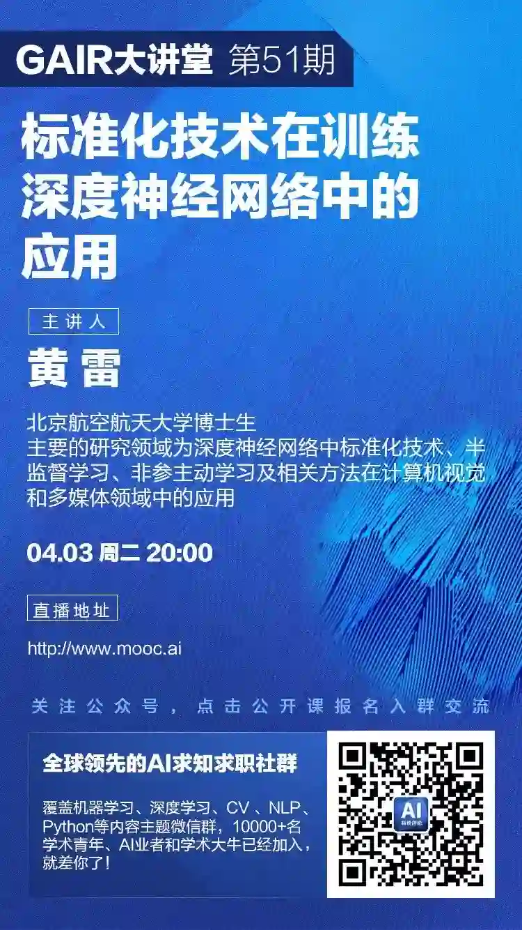 标准化技术目前已被广泛应用于各种深度神经网络的训练,如著名的批量标准化技术 (Batch Normalization, BN) 基本上是训练深度卷积网络的标准配置。装配有 BN 模块的神经网络模型通常比原始模型更容易训练,且通常表现出更好的泛化能力。 本次 GAIR 大讲堂报告人将阐述标准化技术应用于训练深度神经网络中的主要动机以及介绍一些主流的标准化技术,除此之外报告人也将讲解其沿着这个方向发表在 AAAI 2018 的论文《Orthogonal Weight Normalization: Solution to Optimization over Multiple Dependent Stiefel Manifolds in Deep Neural Networks》。