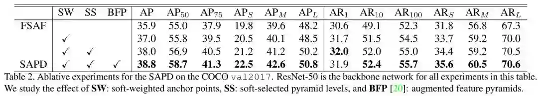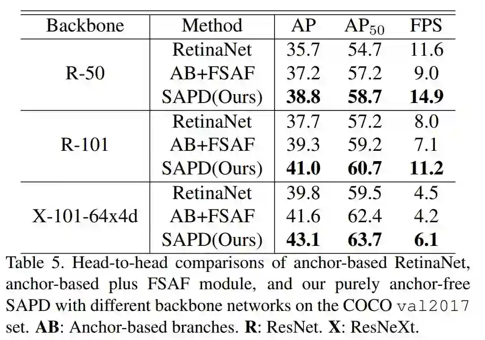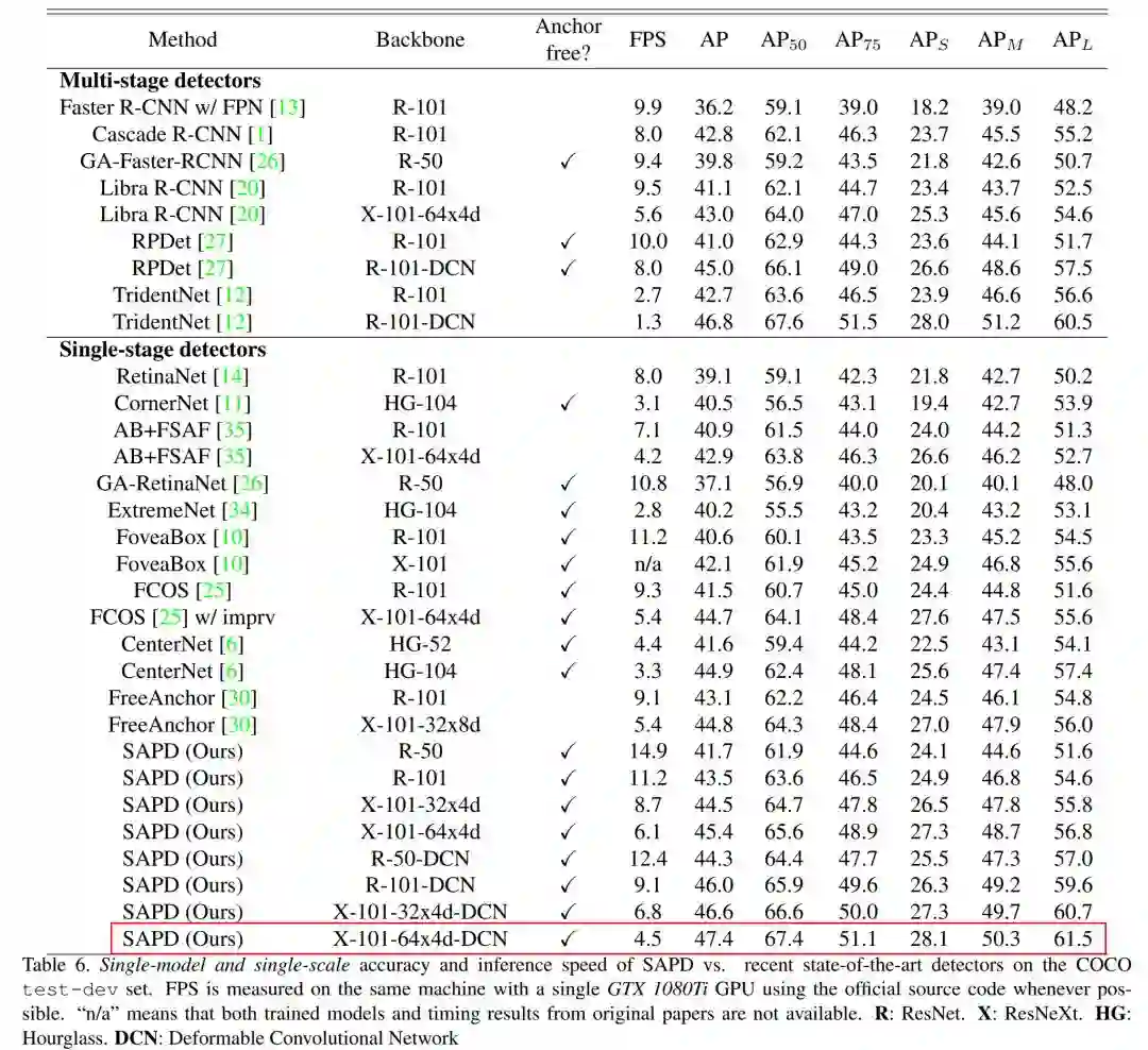 为了评估算法的有效性,作者训练了一个称为SAPD:Soft Anchor-Point Detector的single-stage anchor-free 检测器。实验表明,优雅的 SAPD 将速度/准确度的 trade-off 达到了一个新的水平,超过了之前的 anchor-based,anchor-free,single-stage和 multi-stage 检测器(这里其实都是各家吹捧的点,各种打败SOTA,大家听听就好,因为实际上目前并没有出现mAP和FPS都是SOTA的检测算法)。