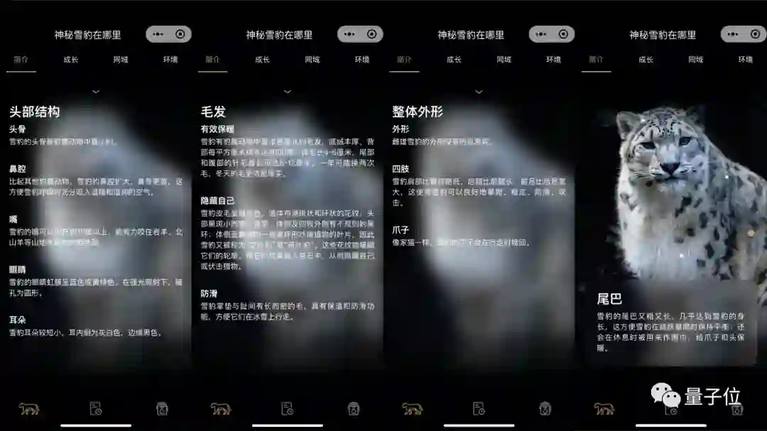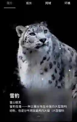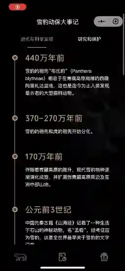 短短的几分钟时间,通过这样一个小程序,不仅仅是对雪豹这种生物有了非常详尽的科普,更像是伴随着经历了它的「前世今生」。