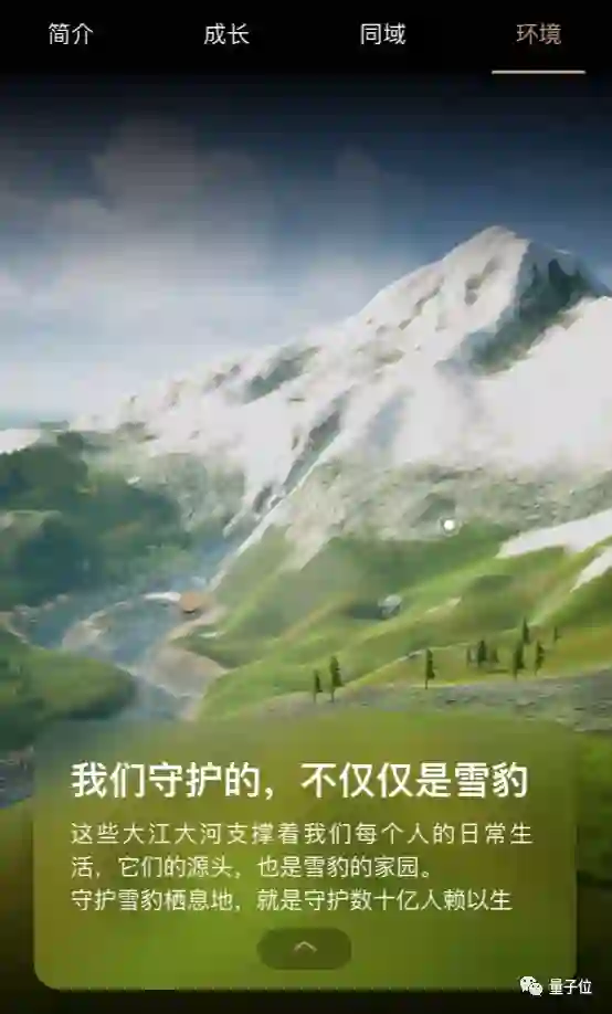 在这个界面的文字介绍中可以了解到,雪豹所生存的家园,正式支撑着我们每个人日常生活的大江大河的源头。
