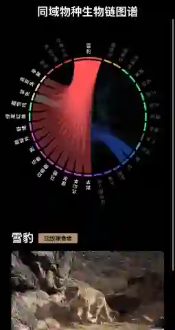 在第三个版块「同域」中,展示了与雪豹相关的同域物种生物链图谱: