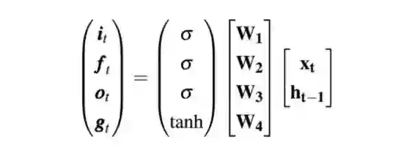 公式(2)是说当前的隐层状态 ht 是从当前记忆单元得到的,其又由输出门(output gate)ot 来控制。LSTM的循环模块里的输入门 it 、遗忘门 ft 、输出门 ot ,以及需要新输入的信息 gt 可以用以下公式简洁地表示: