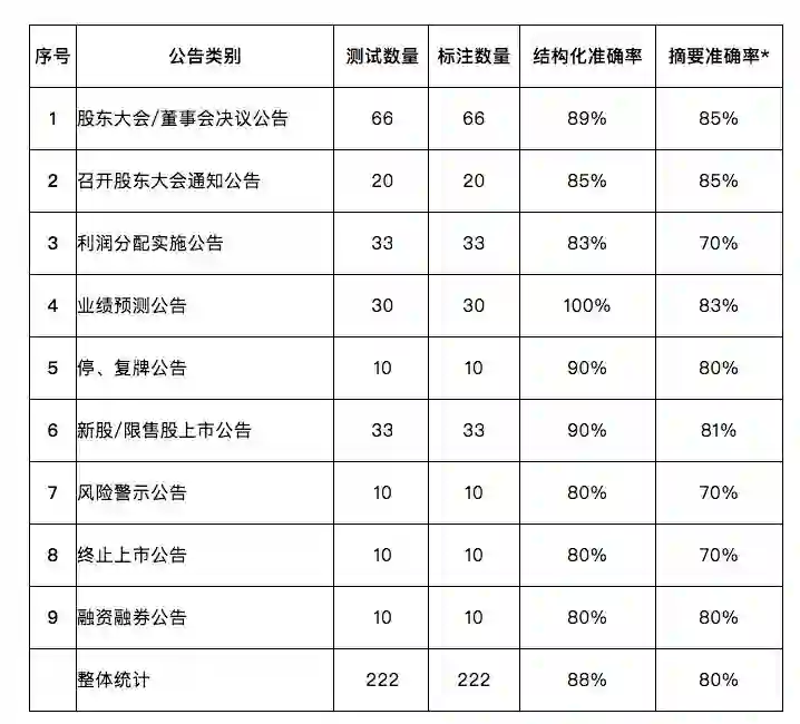 本文在3000+公告数据集上对系统的最终效果进行了回测分析,在其中222篇有人工标注摘要结果的公告数据上进行了准确率分析。测试结果如表1所示,可以看到,无论是结构化提取准确率,还是摘要生成准确率(评估值),都比较令人满意。