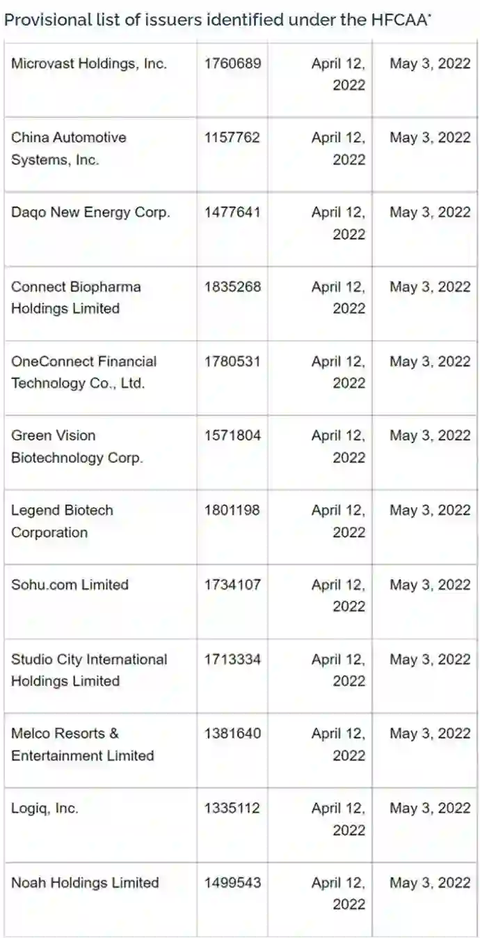 这已经是 3 月以来第四批被纳入「预摘牌名单」的中概股企业。前三批被列入名单的企业具体如下: