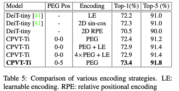 Table 5 给出了 CPVT-Ti 模型在不同编码策略下的表现。其中在从第 0 个到第 5 个 Encoder 各插入一个 PEG 的性能最优,Top-1 准确率达到 73.4%。CPVT 单独使用 PEG 或与可学习编码相结合也优于 DeiT-tiny 在各种编码策略下的表现。