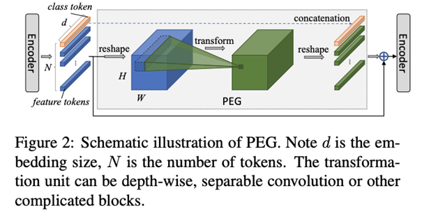 在 PEG 中,将上一层 Encoder 的 1D 输出变形成 2D,再使用变换模块学习其位置信息,最后重新变形到 1D 空间,与之前的 1D 输出相加之后作为下一个 Encoder 的输入,如 Figure 2 所示。这里的变换单元(Transoformation unit)可以是 Depthwise 卷积、Depthwise Separable 卷积或其他更为复杂的模块。