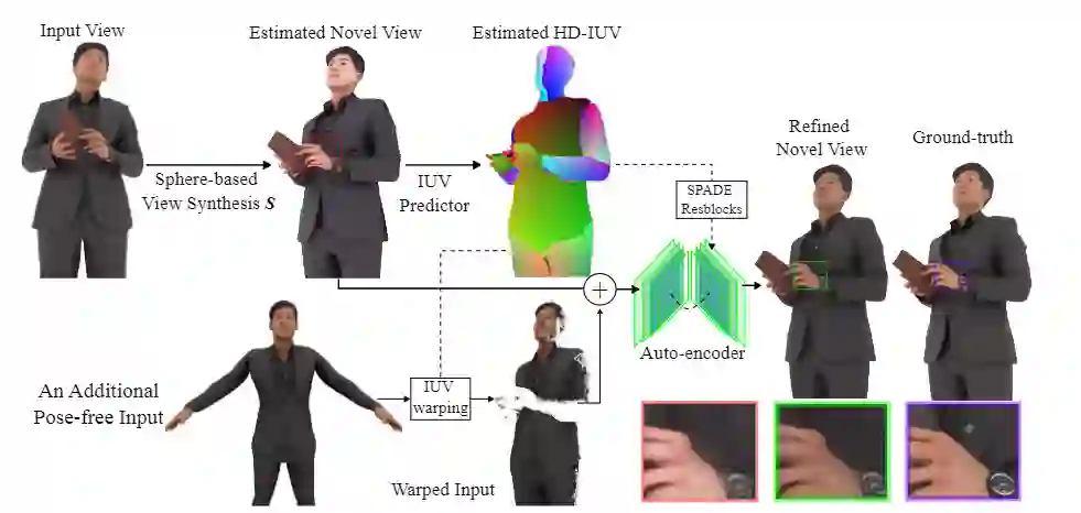 通过训练一个紧凑的Enhancer网络来完善最初估计的新视图,预测新视图和无遮挡图像之间的对应关系,使用一个新的HD-IUV模块对渲染图进行精炼处理,可以呈现出更清晰的结果。