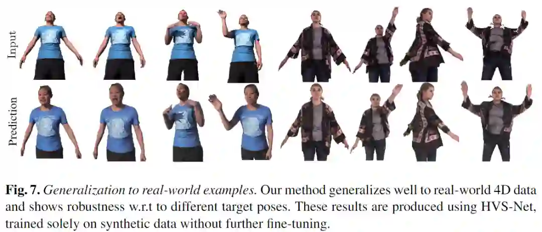 除了合成测试集,研究人员还收集了一个真实世界的测试数据集,其中包括运动中的人物的3dMD 4D扫描图。3dMD 4D扫描仪是一个全身扫描仪,可以在60Hz的频率下捕获未配准的体积点云。
