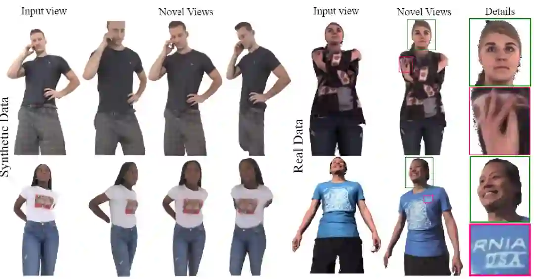 实验结果显示,该方法在单一稀疏的RGB-D输入的情况下仍然可以生成高质量的合成和真实人类的新视图,并且能够泛化到未见过的新人物、新的姿势并忠实地重建面部表情。