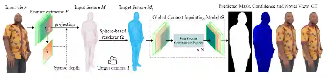 论文中提出了一个架构来学习基于球体(sphere-based)的神经渲染所获得的新视图中的稠密特征,并使用全局上下文绘画模型来创建完整的渲染图。
