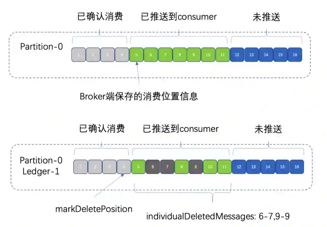 与 Kafka、RocketMQ、TubeMQ 等不同,Apache Pulsar 不仅仅会针对每个订阅的消费进度保存一个最小的确认位置(即这个位置之前的消息都已经被确认已消费),也会针对这个位置之后且已经收到确认响应的消息,用 range 区间段的方式保存确认信息。