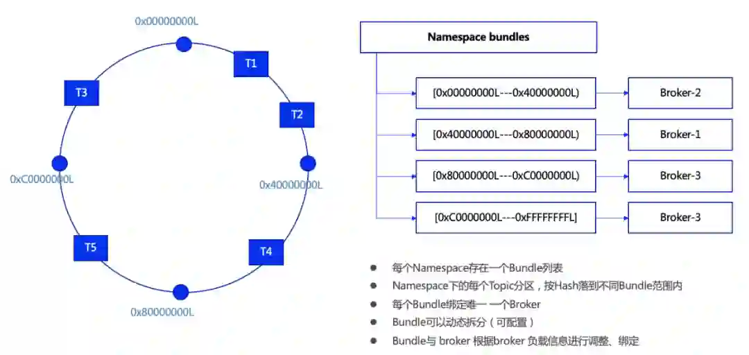 Pulsar 会在每个 Namespace 级别配置 bundles ,默认 4 个,如下图所示。每个 bundle range 范围会与一个 Broker 关联,而每个 Topic 的每个分区会经过 hash 运算,落到对应的 Broker 进行生产和消费。当过多的 Topic 分区落入到相同的 Broker 上面,会导致这个 Broker 上面的负载过高,影响消息的生产和消费效率。