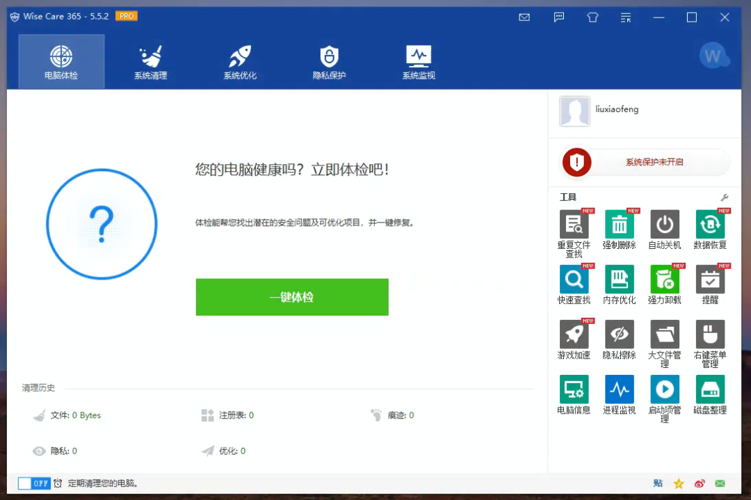 主要功能上,Wise Care 365 围绕系统维护这一核心功能分为「系统体检」「系统清理」「系统优化」「隐私保护」以及「系统监控」五大模块。所以经过对比不难发现,Wise Care 365 功能更为纯粹和垂直,没有国内同类应用中常见的软件下载中心、驱动下载中心这类工具集成。更重要的是,这里面大部分功能并不需要升级至专业版,免费版授权就可以正常使用。