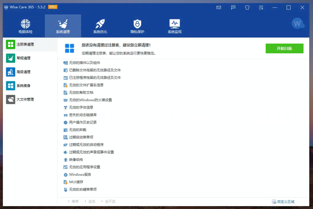 如果你并不希望通过所谓的体检的方式进行维护,也可以直接前往子项页面单独操作。每一个子项目中都罗列了可以进行操作的部分,以我自己最常用的系统清理为例,Wise Care 365 提供的清理功能包含注册表清理、常规清理、高级清理以及系统瘦身等常见功能,和同类清理工具一样,我们可以对扫描结果中的清理项目进行自定义选择,根据需要清理或忽略某些项目。