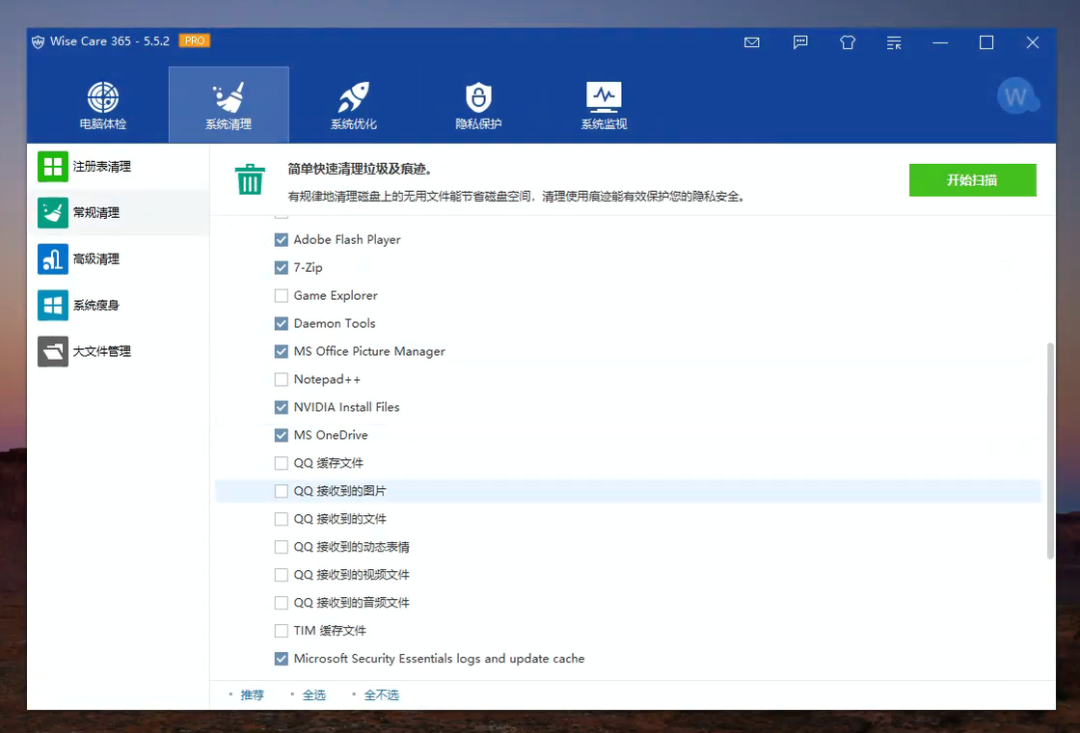 作为一款本土化的小众系统维护工具,Wise Care 365 还非常贴心地内置了不少常见国产软件的相关清理项目(QQ 默认缓存占用非常大),扫描清理后的效果也是相当明显的。