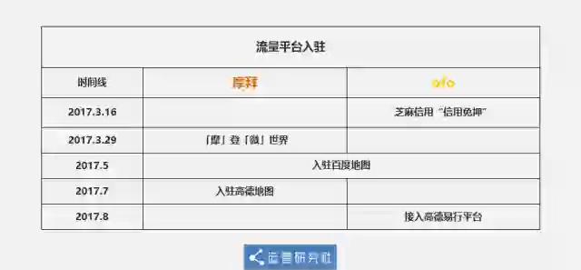 5 月底,摩拜、ofo 宣布入驻百度地图;7 月底摩拜宣布入驻高德地图,用户可登陆实现地图导航;8 月 ofo 小黄车接入高德易行平台,用户升级到最新版高德地图,通过主页上的共享单车快捷按钮,或「路线→骑行」页面的共享单车入口,即可扫码或输入编码解锁附近所有的 ofo 小黄车。