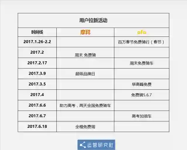 在用户拉新的活动运营上,可以说从今年 2 月份到 6 月份都是 ofo 领跑摩拜单车的,几乎都是小黄车先策划摩拜隔两天左右时间跟进。