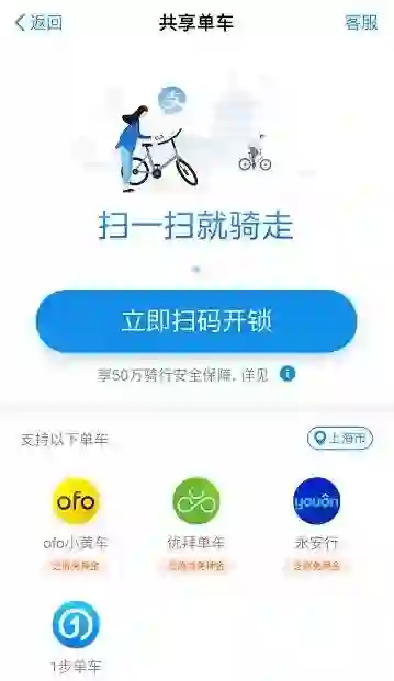 3 月 16 日,ofo 与芝麻信用达成战略合作推行“信用免押”模式,虽然在支付宝有了入口,不过藏的也忒深了(更多应用-便民生活),而且支付宝与 ofo 并非独家合作。