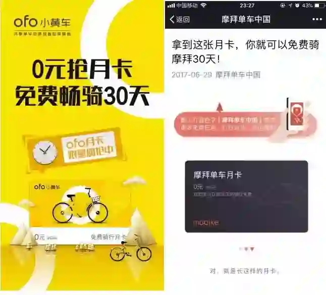 ② 摩拜后期利用免费月卡,实现弯道超车,开始了逆袭之路,将 ofo 的用户洗了个半。