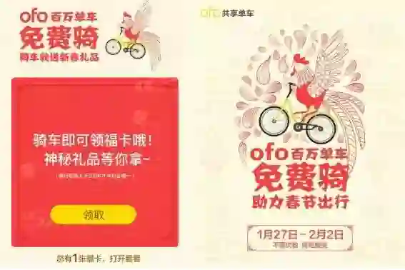 2017 年 1 月 26 日上线的“百万春节免费骑行活动”,共享单车价格战号角吹响。用户在 ofo 免费