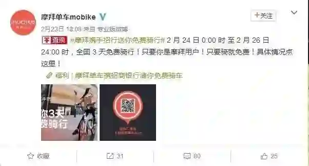 后知后觉的摩拜单车在 ofo 推出免费骑行近半个月后,才在 2 月底推出了“招行X摩拜免费骑行活动”。