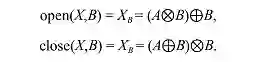 由于噪声的影响,图像在阈值化后所得到的边界往往是很不平滑的,物体区域具有一些噪声孔,背景区域上散布着一些小的噪声物体,对分割后的图像进行图像形态学开闭运算处理,用来消除小物体、在纤细点处分离物体、平滑较大物体的边界,同时并不明显改变其面积。腐蚀操作会去掉物体的边缘点,细小物体所有的点都会被认为是边缘点,因此会整个被删去。再做膨胀时,留下来的大物体会变回原来的大小,而被删除的小物体则永远消失了。膨胀操作会使物体的边界向外扩张,如果物体内部存在小空洞的话,经过膨胀操作这些洞将被补上,因而不再是边界了。再进行腐蚀操作时,外部边界将变回原来的样子,而这些内部空洞则永远消失了[12]。开运算和闭运算的运算规则如下: