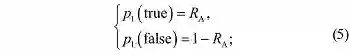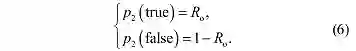 本文定义辨识框架为 U={true,false},记连通区域面积比 R_A、垂直方向重叠率为 R_O,辨识框架下的 2 个命题分别为 A_1、A_2,其相应的证据概率函数为 p_1、p_2,两连通区域面积比接近 1 的时候,连通区域属于同一车辆的概率比较大,垂直方向重叠率越接近 1,两连通区域在同一水平的概率越大,因此两个命题的基本概率函数值由下式确定: